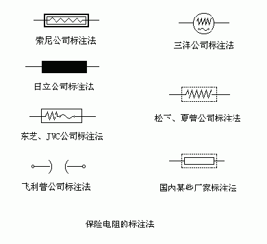 尽管保险电阻在电源电路中应用比较广泛,但各国家和厂家在电路图中的标注方法却各不相同。虽然标注符号目前尚未统一,但它们却有共同特点: